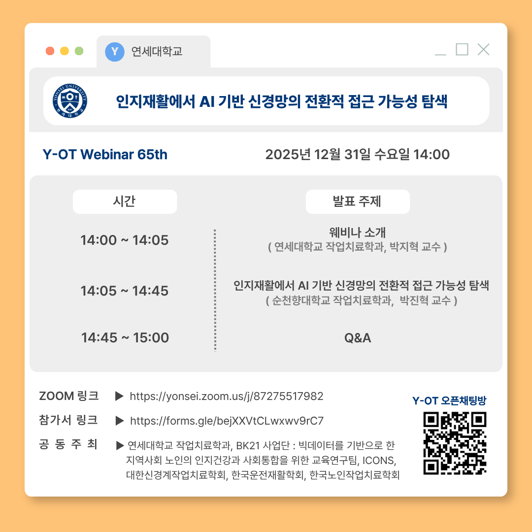 - [웨비나] 인지재활에서 AI 기반 신경망의 전환적 접근 가능성 탐색 (25년 12월 31일 목요일 오후 2시)