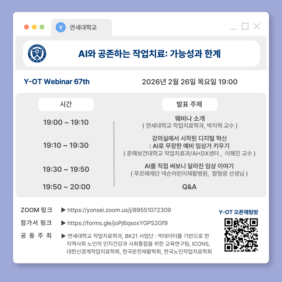 <2026년 2월 제 67회 Y-OT WEBINAR 안내>안녕하십니까. 제 67회 Y-OT 웨비나 공지드립니다.